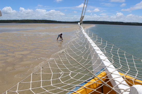 In the middle of the lagoa you can find a beach. How weird, right? The Maria-Maria boat pulls out the anchor so that we can go for a walk on this lovely beach. The best part is that there are tons of crabs walking on this beach. Once I approach them they quickly hide themselves into the sand or walk sidewards into the water which looks amazingly cute. I think I should try to catch one and a couple I met on the boat feels the same way. We decide to go for a beautiful blue crab and finally succeed to let hold him in our hands – of course afterwards we release him again into the warm waters where he came from.