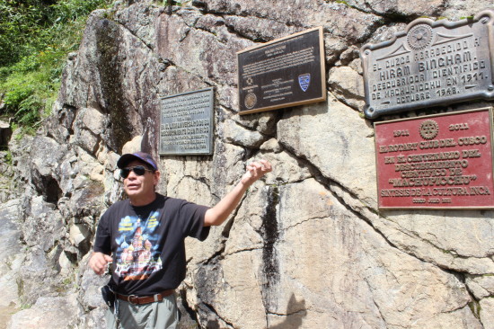 A local guide explains about the making public of the existence of Machupicchu by Hiram Bingham