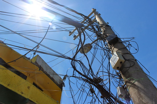 We start walking through the favela and reach what seems to be the center of the place. Many people are walking around, buying fruits, talking to each other on the streets and again many people stare at us. What catches my attention are the electricity wires which seem to be everywhere. The electricity poles are full of attached systems that can provide electricity non-legally. People here seem to be not used to paying for these services so they found a way to receive the service anyway.