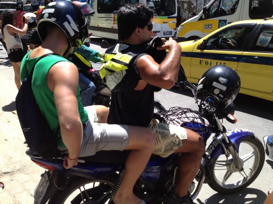 The minivan goes up to the “entrance” of the favela and from there we have to continue by motor taxi. All of the motor taxis are waiting at the street corner and one of the guys hands me a helmet. I jump behind him on the motorcycle and he quickly takes off to the highest point of the favela. After a couple of bumps on the road I finally get comfortable and realize this taxi system is quite handy. I think we should get that back home too!