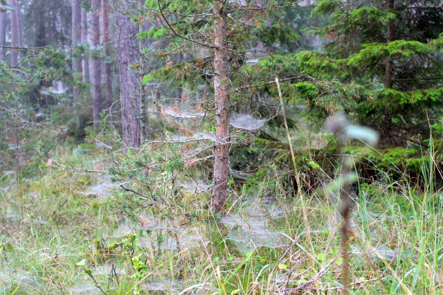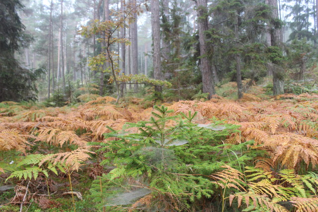 We reach the forest, where the enchantment starts. Whenever I’m in Sweden I always get this feeling of walking through a fairytale. The colors, the smell, the weather, even the wet spiderwebs. It’s somehow all magical. I see many different colors in the leaves, from green to orange and yellow to red. The mushrooms might have been copying the leaves as their colors even match the rest of the forest. The only thing that has it’s unique own color are the lingonberries. The colors get more and more amazing as I walk deeper into the wild. I even see some bushes that are colored purple and it truly amazes me that the rocks, being covered partly by the roots of the trees, have several patterns of colors as well.
