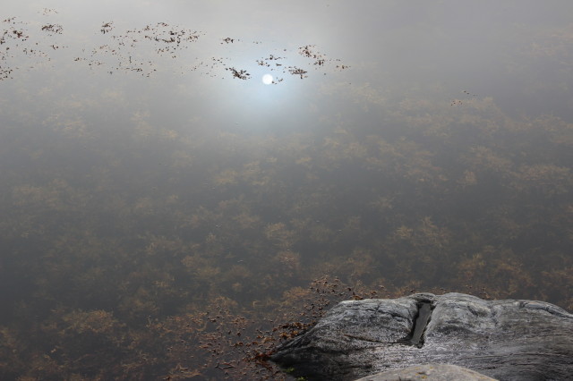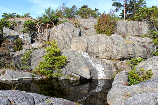 My bag is ready and I’m fully equipped for the following few days. I even carry a knife that allows me to make fire with it. Together with a bunch of international people, talking in English, we start our hike into the ‘Utö naturreservat’. One of the Swedish, who lives on the island, asks us to look left and right and explain our sight. I see something man made, however it has become natural, or at least so it seems. The man explains that there used to be a mine right here where we are now walking, yet time has turned it into a pond.