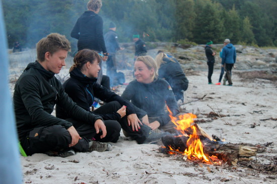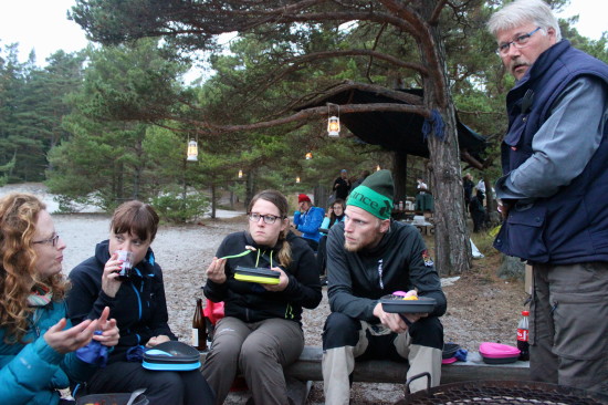 By the time we head out of our tents towards the smell of food everyone has already gotten their fire started. I still have to gather some wood and start my own campfire. I see that my friend Norbert also doesn’t have a fire yet, so we decide to make one together with a couple of others too. We start of with one flat piece of rock, where we place the fire-catching-kind-of-wood and start sparking fire with the knife. It takes us a while to get the technique the way it should, but Norbert – hero – got it. We through some wood on top of the rock with the little flame and it all starts working. Our campfire is a fact. Now, time for food!