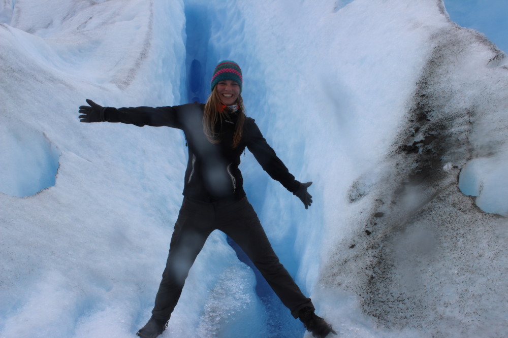 Imagine this: A huge white island of ice in the middle of a lake between the mountain peaks of Patagonia and yourself wearing crampons walking on top of this white with blue colored glacier.