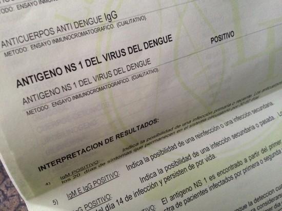 Positive for Dengue. That was all I needed to understand out of the 3 papers that covered the results. Another interesting thing was my platelet count being quite low, but not that low that blood transfusion in a hospital was required. Luckily I “only” had the Dengue Clásico with risk of internal bleeding if I did not rest enough…