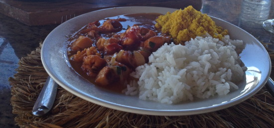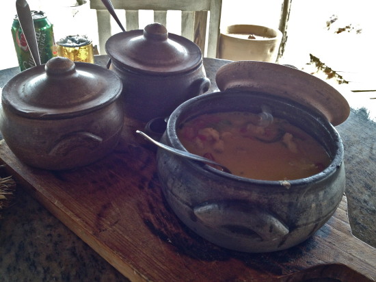 After about 8 minutes a friendly waiter showed up with a wooden plate holding three cooking pots containing white rice, the typical farofa and fish with shrimps soup.