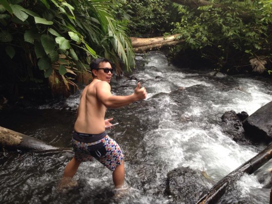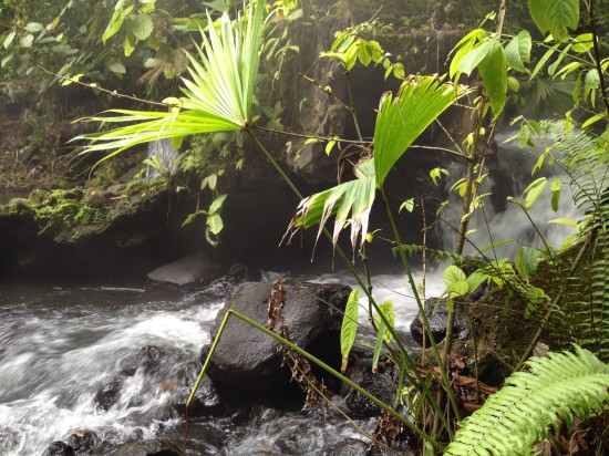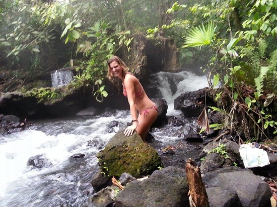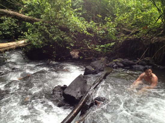 I leave my things in a locker and talk with my friend Patrick through the Facebook chat. He’s staying at another hostel with a pool and a nice lounge area, so I decide to meet him there. We check our tour options for Arenal and figure we should visit one of the spa hotels. That is, until we get into a taxi of which the driver tells us about a secret spa that’s for free. Okay, just bring us to the free one then! The driver stops by the side of the road and explains us where to walk to. He also asks us if we want him to wait for us, since it will cost him more to drive back and forth so he’d rather wait. We decide to make a deal with the guy and promise to be back within 2 hours. The taxi driver gives me one last piece of advise before the walk free local hot springs, “since you’re with him the guys won’t bother you hopefully, but just take care of your bag”. Sure we will. We’ll just take our bag with us to the different streams. And so it was arranged: we had two hours of relaxing in the local hot springs where only the locals go to.