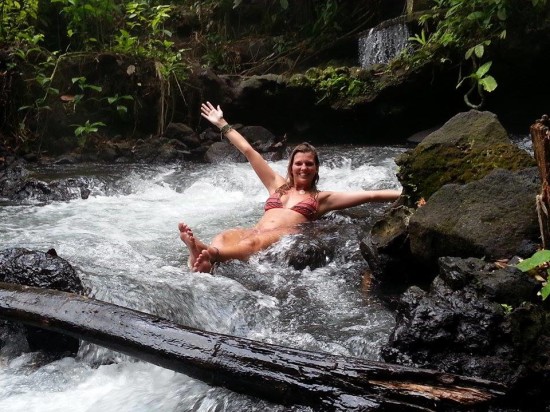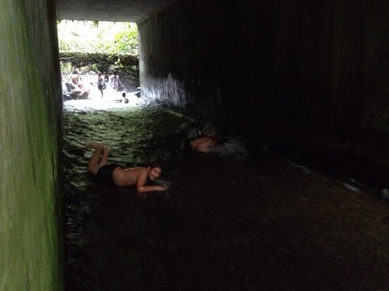 The hot springs get accessible from the bridge, meaning you have to walk down to the ‘river’ and decide where you want to stay. Underneath the bridge some kids are sliding from one side to another while their laugh echoes through the tunnel and their parents watch them. Patrick and I decide to cross the river and leave our things by the riverside to explore the first actual natural pool. And oh my god, it’s soooo nice! The water is hot and it feels good to bathe in these natural surroundings after traveling in the sweaty hot weather of Costa Rica. We decide to explore a bit more of the hot springs, so we take our things and walk through the jungle by the riverside a bit further away from the bridge. It just got better. It start to rain! With the refreshing drops of mother nature it’s almost as if we were in a sauna right now and got the cold plunge all naturally. However, we do enjoy the hot water more, so we enter the hot springs once again at a different part of the river. We leave our things at the riverside and I let Patrick, carefully, explore this part of the hot springs. It’s a bit more slippery due to the moss, but my friend manages to find a comfy spot to relax at. Now it’s my turn to walk in. Of course I manage to fall down 2 or 3 times before I find a good spot to sit at, but it’s totally worth it.