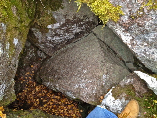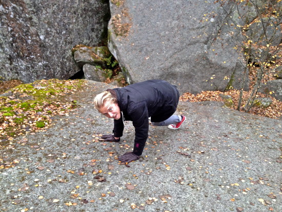 The huge rocks invite you for fun and adventure, but at the same time there are some legends and tales about them. After a few minutes of climbing Thom and I reach the highest peak. From underneath the big rock in the middle it should be possible to reach a cave that is three times 7 meters. It was here where the so-called Kanabergstjuvarna (thieves) lived in the early 1800’s. Maybe they were hiding some of their treasures in these caves? Everywhere there are deep holes that could be entrances for caves. We climb a few meters down from the top and find something that we believe may be the entrance to the large cave but we don’t dare to enter this narrow crawling hole. We have a flashlight on our phone, but a rope and some even more comfortable clothing would have been handy.