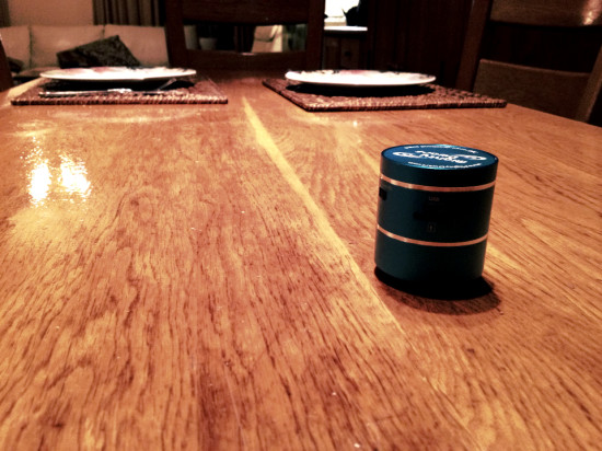 Now that I can insert the SD card with my own music into the Mighty Dwarf speaker I need to find the perfect spot to place you. Hm, do you prefer a wooden table or a piece of furniture with glass? It all gives a different sound. I figure I should try it all, and later on I will make up my mind on which sound and place will be my favorite. The speaker is located on the bottomside of the Mighty Dwarf, which provides you with 360° of sound.