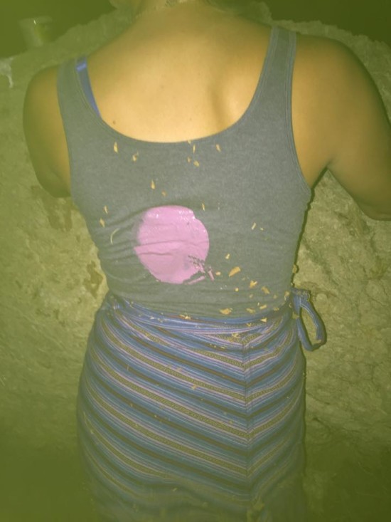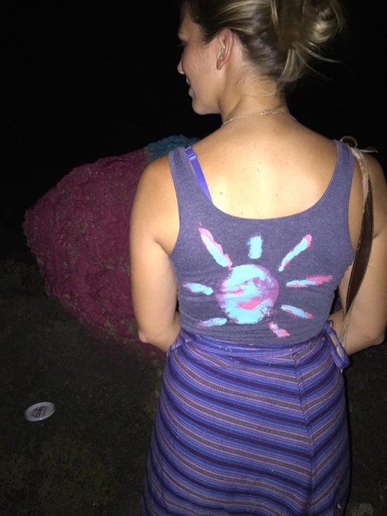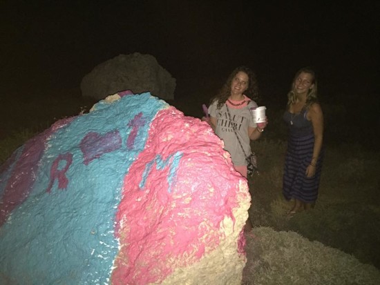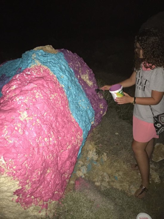 We throw the two bags on the ground with the paint and the brushes and start exploring the area around the stone. Can we all stand around it at the same time? Oh, Amanda already started painting – okay, now Maud and I have to combat about who takes the second best spot. Somehow we manage to get all three of us to paint at the same time without having to stand in the spikes, but I have the feeling that there must be a better, an easier way to paint all together. I decide to climb on top of the rock. Then it happens. The part of the rock I am holding on to falls apart. Within seconds I find myself laying in those nasty little thorny bushes, which is also exactly the spot where Amanda left the cover of her paint bucket. My friends check if I am okay and thankfully everything is alright. I stand up and turn my back to one of my friends to start painting again, but she gets a giggle. I appear to have a big circle of pink paint on the back of my top together with a bunch of spikes from the bushes.